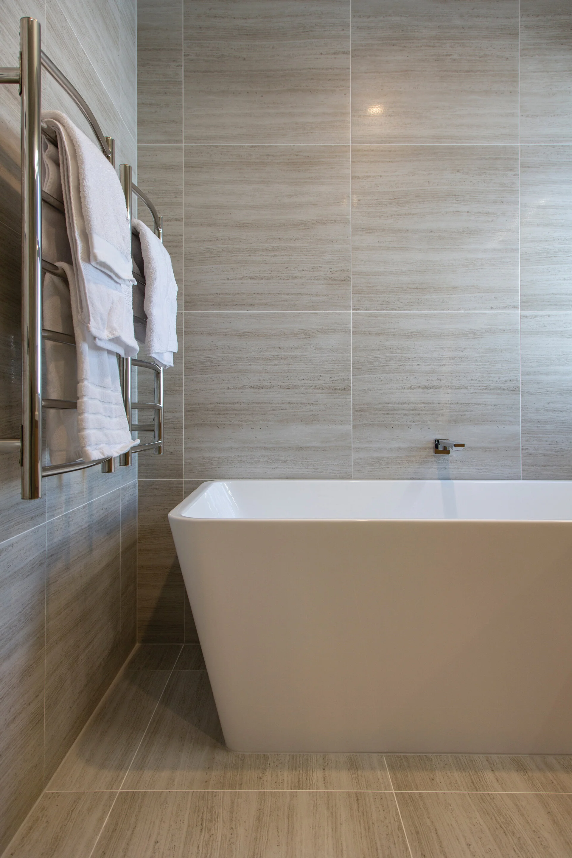 Kitchen cabinetry is clad in a high-pressure laminate that gives the look of solid oak but is more hardy, important for homes that have a high turnover. This lends a contemporary aesthetic and provides a sense of warmth, which is offset against the white benchtops.