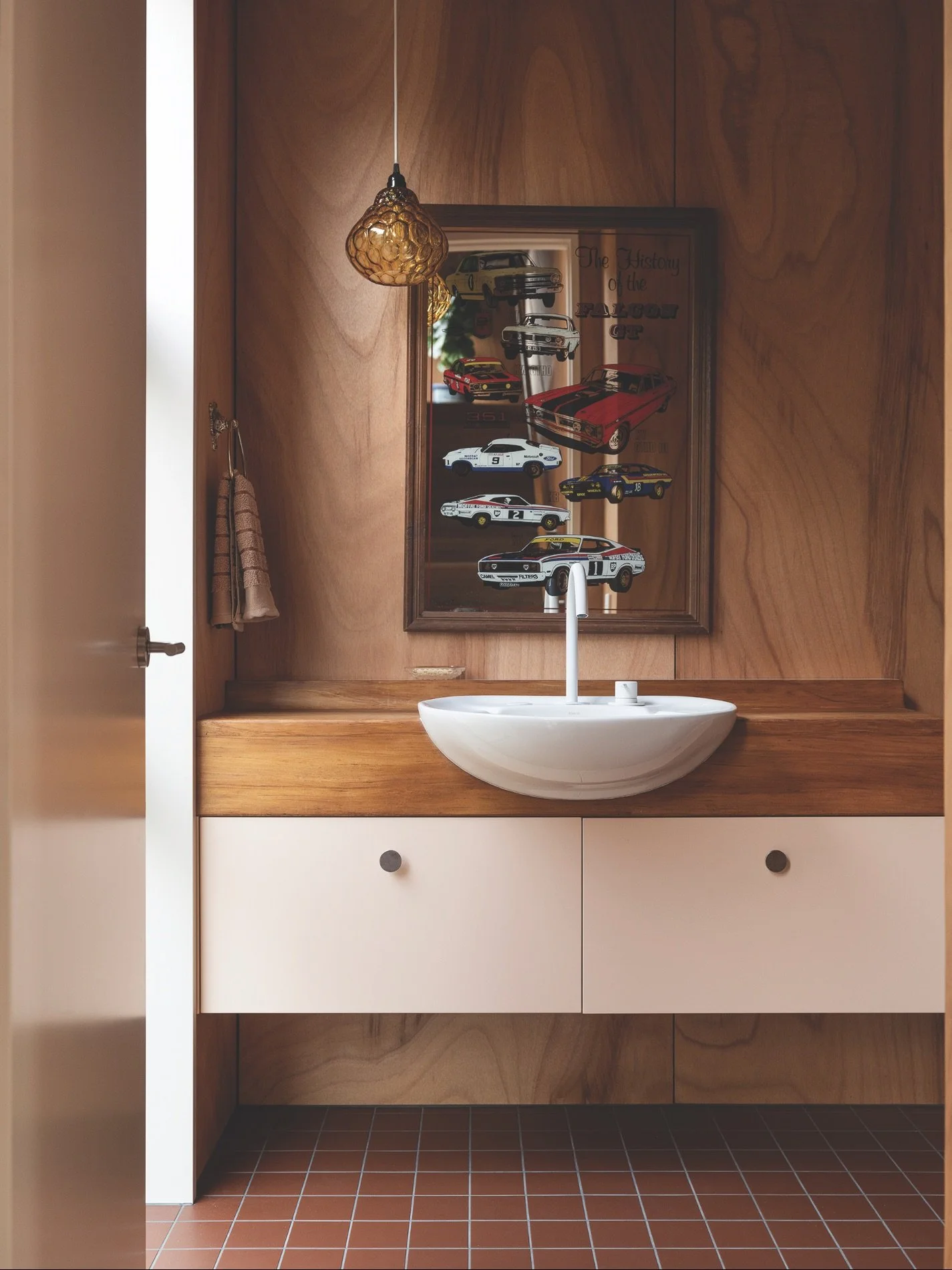 We enjoyed the contrast of the bold and beautiful yet meticulously detailed exterior with a more surprising, warm and playful interior. The downstairs level is light and bright and inviting, while upstairs it is dark, warm and moody (and private). Some of our favourite materials include the rainbow onyx splashback in the kitchen and the burgundy carpet in the bedrooms, which is so cosy and calming. There are no white finishes in the house – the plasterboard walls downstairs are a beige called Resene Half Bone. We wanted a colour that worked well with the pink and chocolate undertones in our spotted-gum timber flooring, and this was the perfect warmth without being too brown. We also have accents and highlights of Resene Romantic, including the full-height kitchen cabinets, the cabinet fronts in the powder room, the stair balustrade capping, and the ceiling in our shower room. It’s a subtle and cheerful pop of colour, and makes us feel great. And it has such a fantastic name!