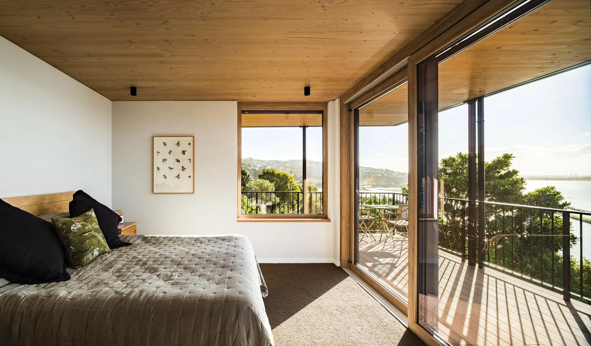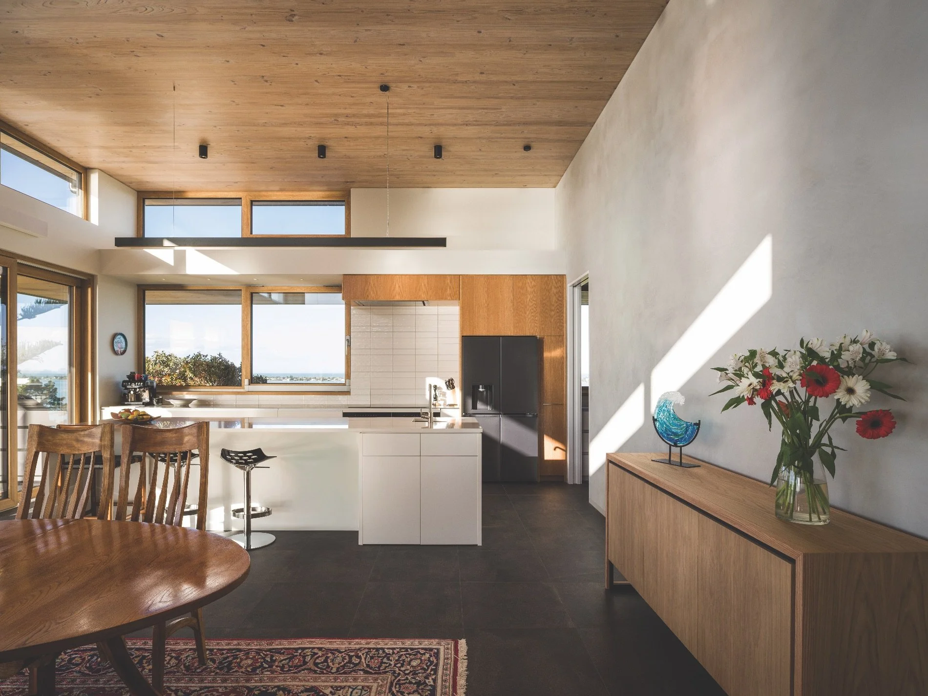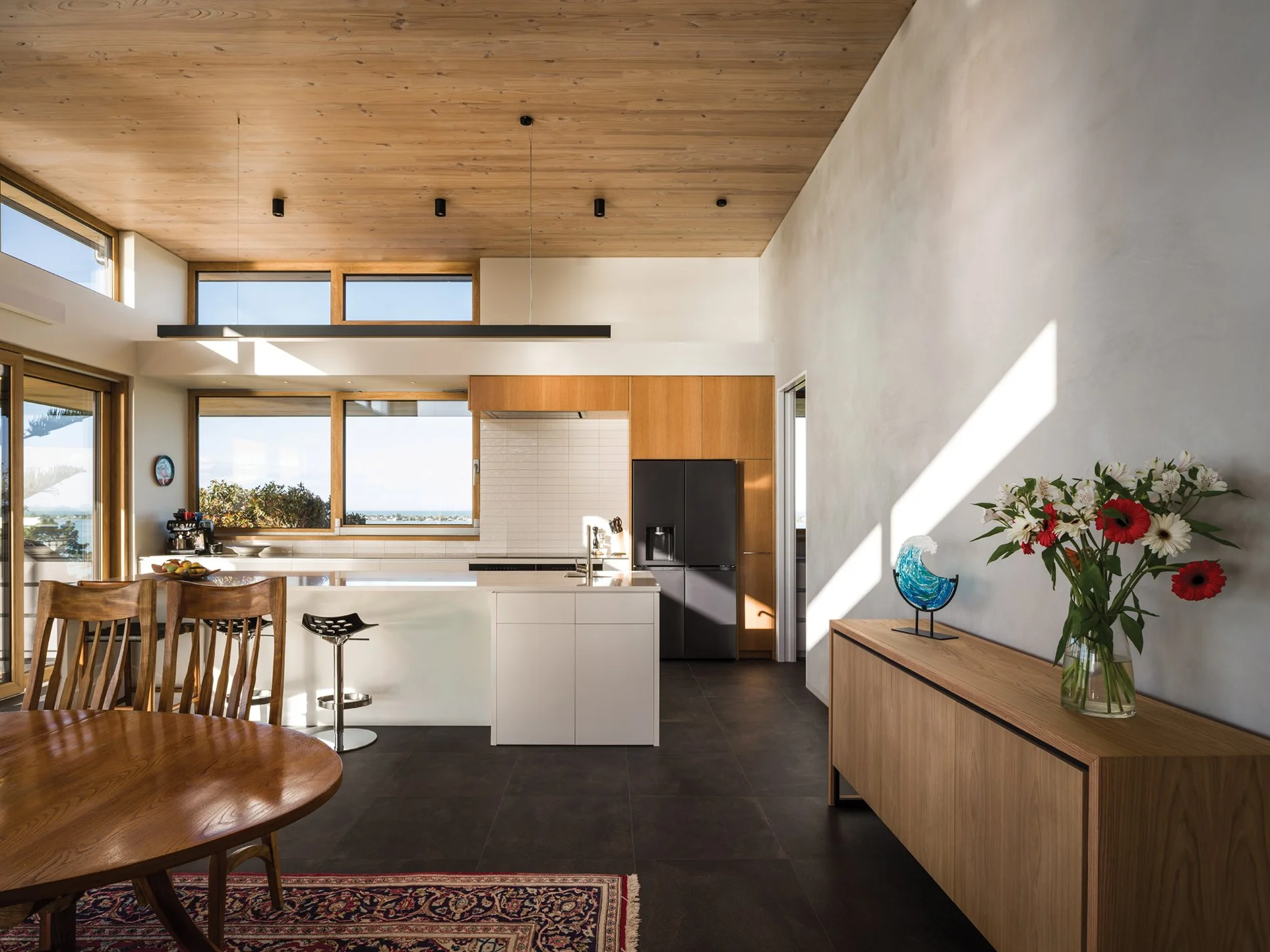 The design brief was ambitious, with the homeowners wanting earthquake resilience, sustainability, comfort, liveability and elegance. “In addition we wanted a home that maximised the views and at the same time had wall space to display our art collection,” says the homeowner.
