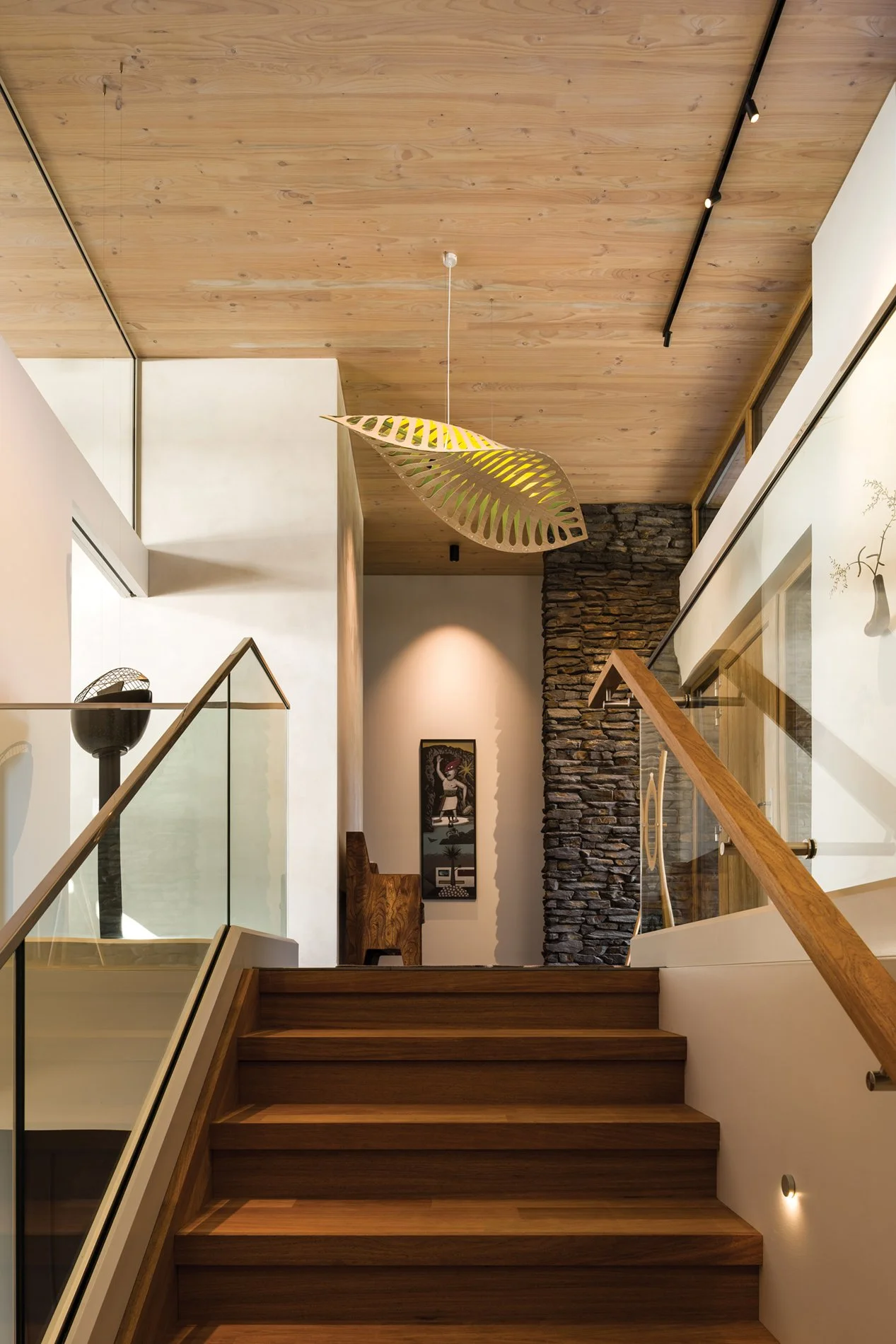 The main feature wall in the home uses a Rockcote Artisan natural plaster finish from Resene Construction Systems, installed by Properly Plastered Ltd.