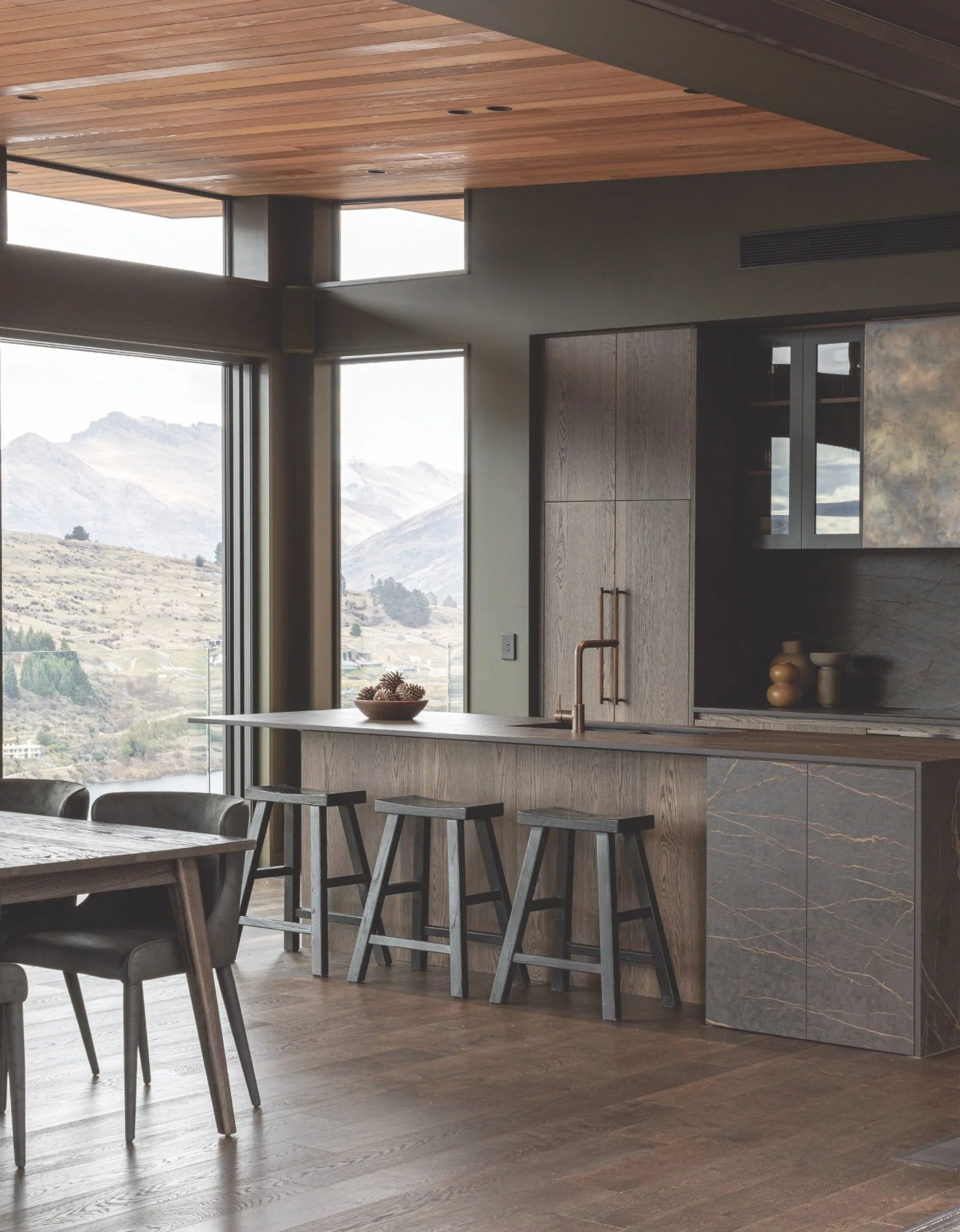 within a considered, restrained palette allows for artful, playful moments. “The kitchen exemplifies this approach perfectly, with a richly toned benchtop and splashback that emulate the surrounding rock faces, and deep green and smoky brown tones that echo the alpine forest,” says Jess.