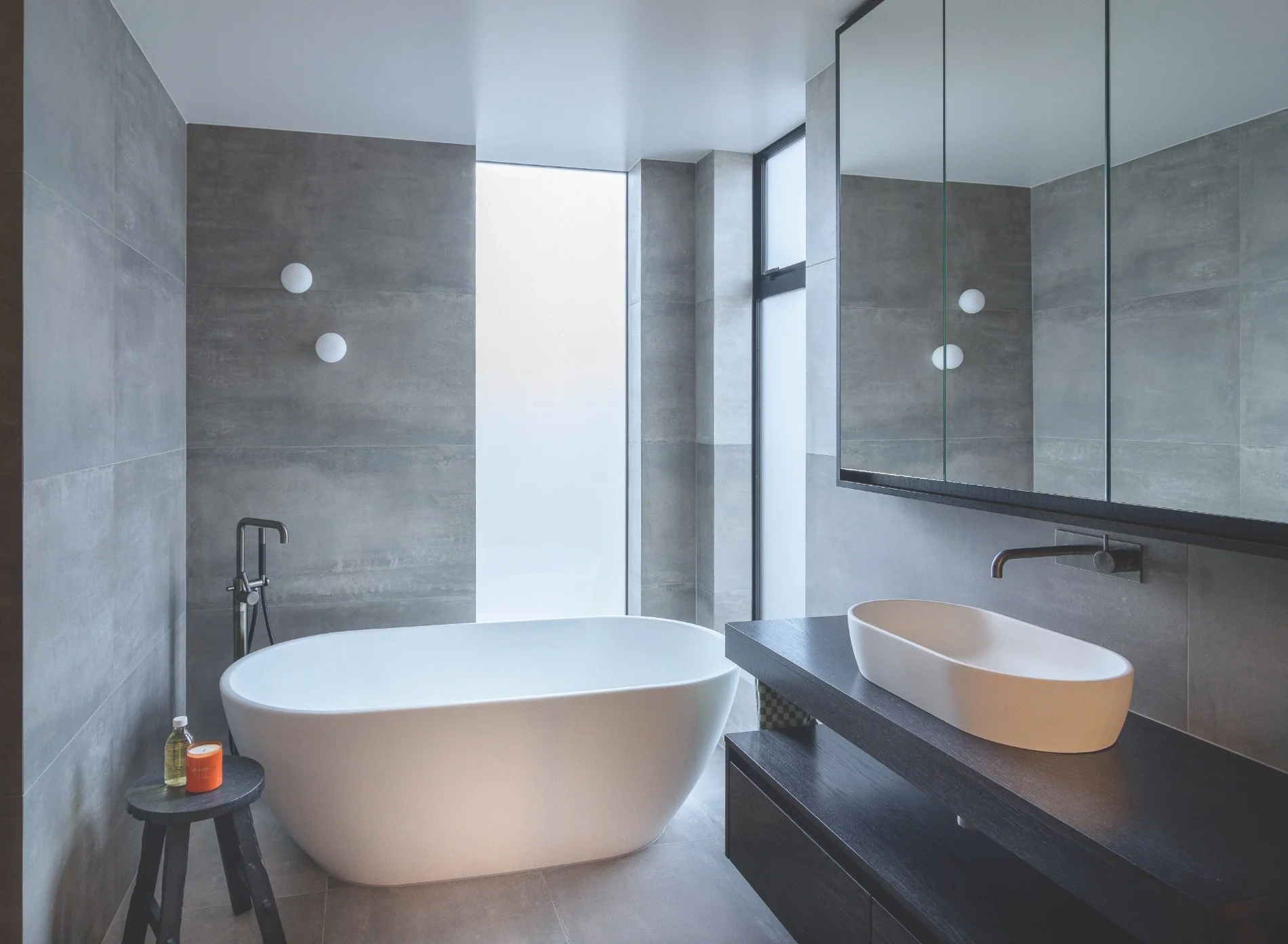 The Nextdore bathroom tiles in this home are varying shades of concrete with a hint of a metallic oxide and were installed by J&C Tiling.