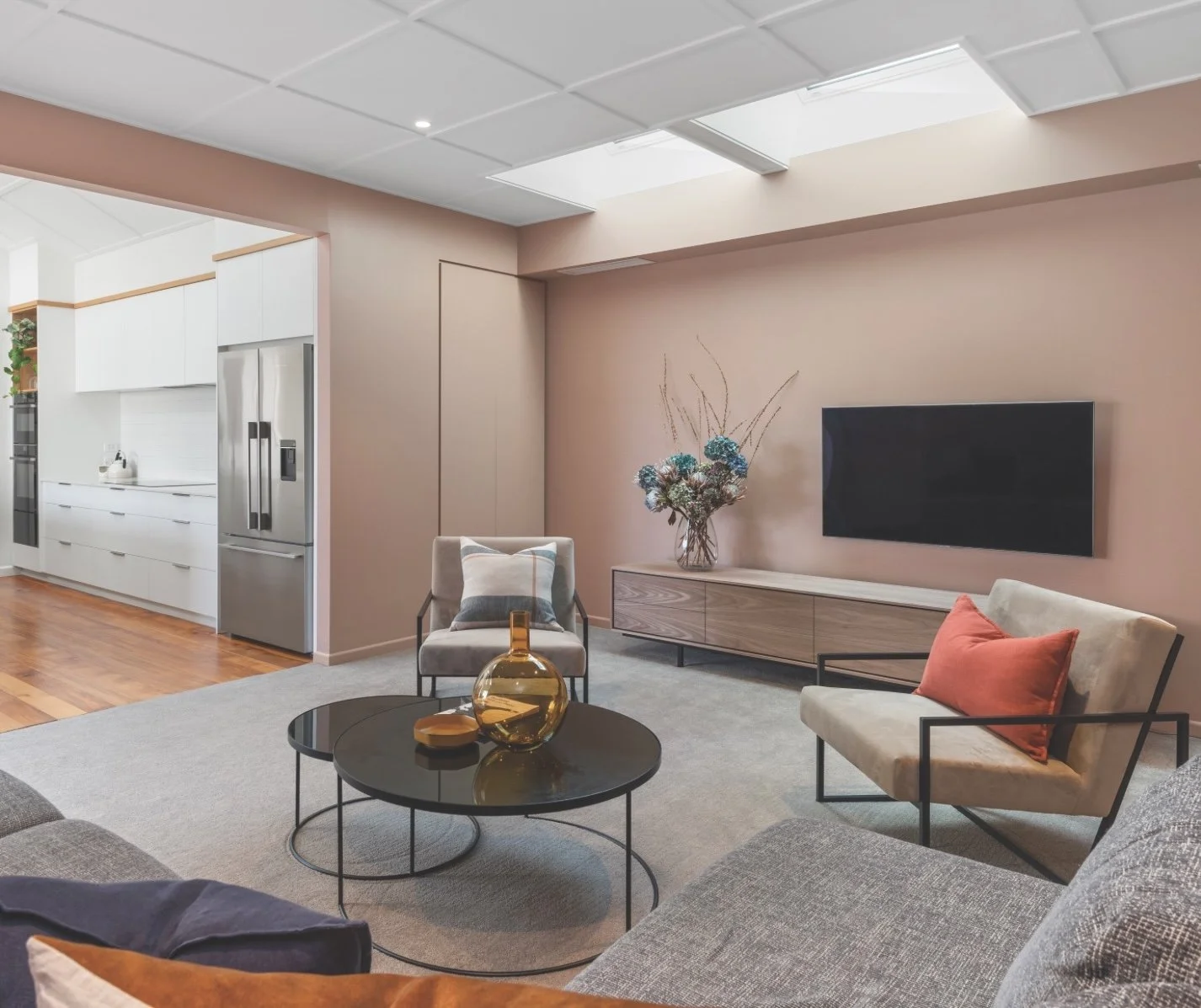 There are many aspects of choosing the perfect colours for a home, and this can be overwhelming. It’s important to consider how colour behaves; what may look beautiful on the north side of the house may not work as well on the south side. Colour use in each space depends on what’s happening in that room. Do we want the colour to be the hero, or something else, such as joinery, art or a stunning view? Further, not only does the colour have to work with what’s going on in each room, it needs to have connections to all the spaces as you move through your home. We believe in choosing colour with purpose.