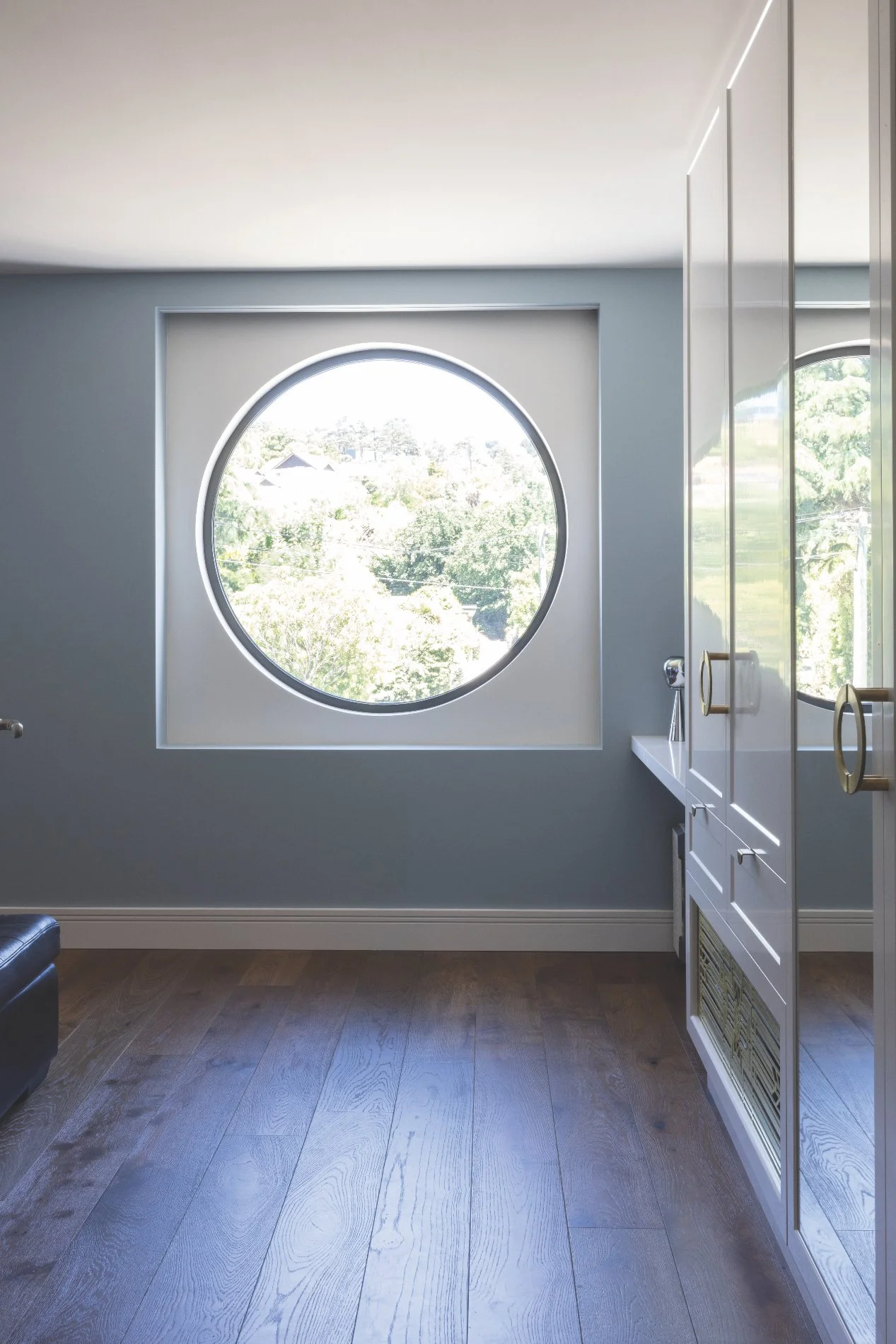 The extensive joinery work in the home, including the kitchen, inlaid brass and timber veneer doors, living room units and wardrobes, was completed by Sydenham Joinery.