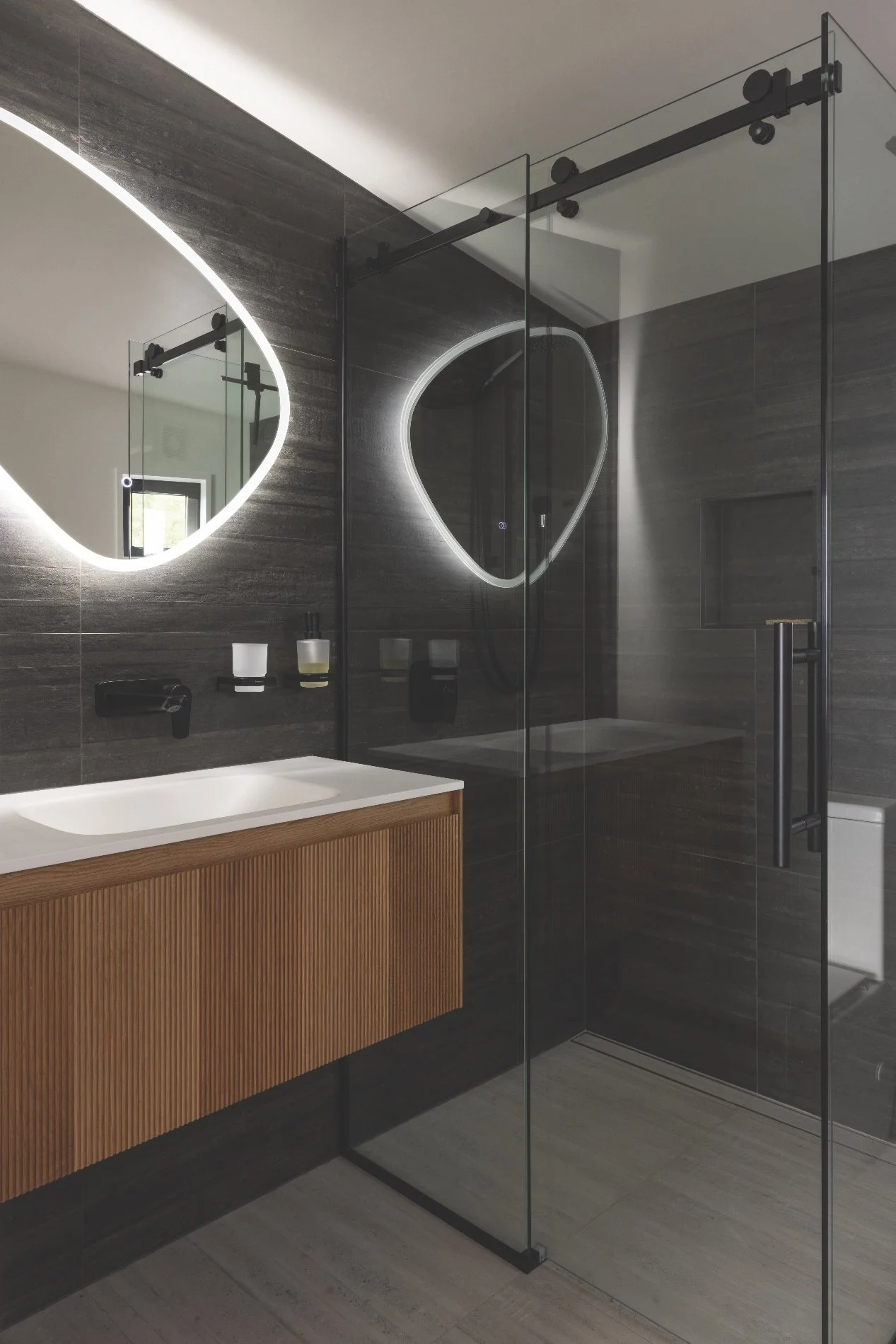The challenges from a construction point of view were numerous. Beyond the structural complexities of the fan-shaped, multi-level design, the house’s predominantly south-facing orientation required careful consideration of thermal performance and natural light. For example, the ensuite bathroom, with its low raking ceiling and angled exterior wall, needed creative solutions that the homeowners then enhanced with beautiful tiles and fixtures.