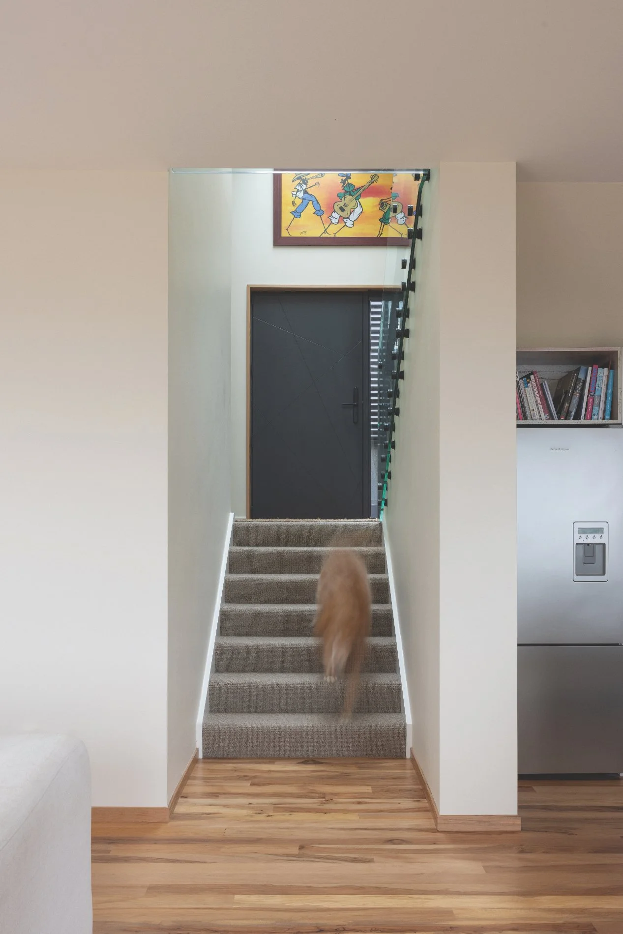 The interior transformation was equally dramatic. The removal of the old framed stairwell made way for an elegant glass balustrade that has opened up the entrance way and allows more light to flood into the central space. New thermally broken double-glazed skylights replaced the old single-glazed units, dramatically improving both thermal performance and natural light quality. The original kitchen was carefully removed, stored during construction, and reinstalled upon completion.