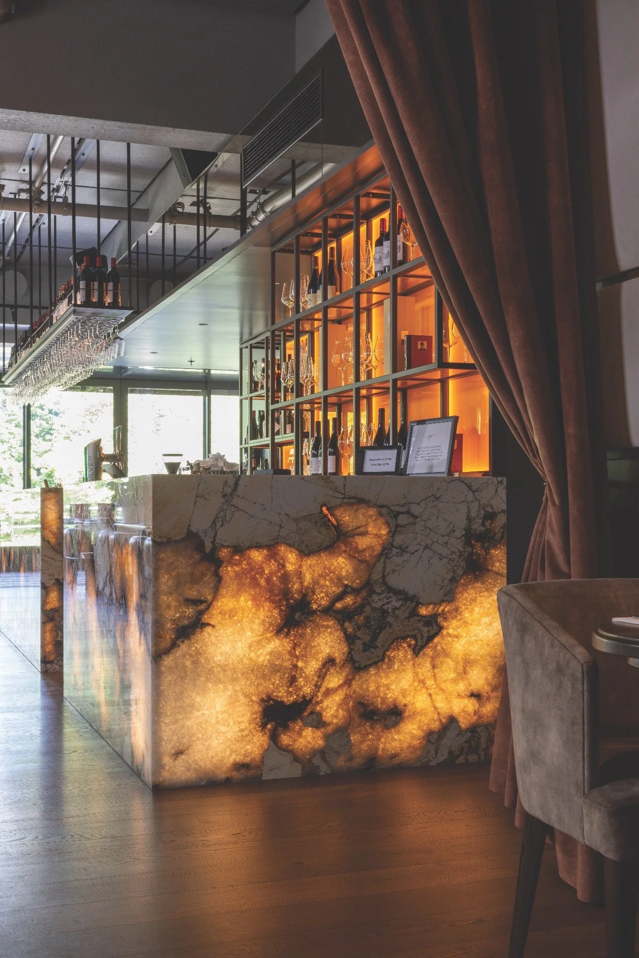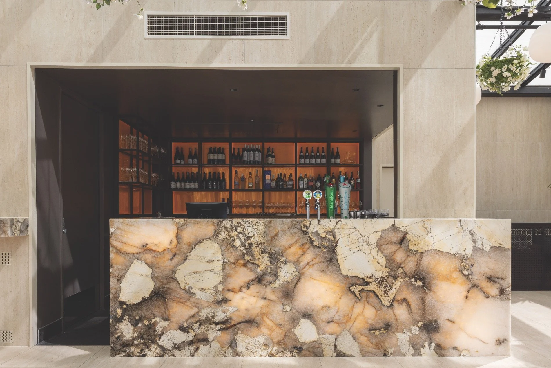 Each slab was hand-selected and imported to meet the Warrings’ design expectations. The translucent qualities of the stone lend themselves beautifully to backlighting, creating a dynamic, atmospheric feature behind the bar that shifts subtly as the light changes throughout the day.