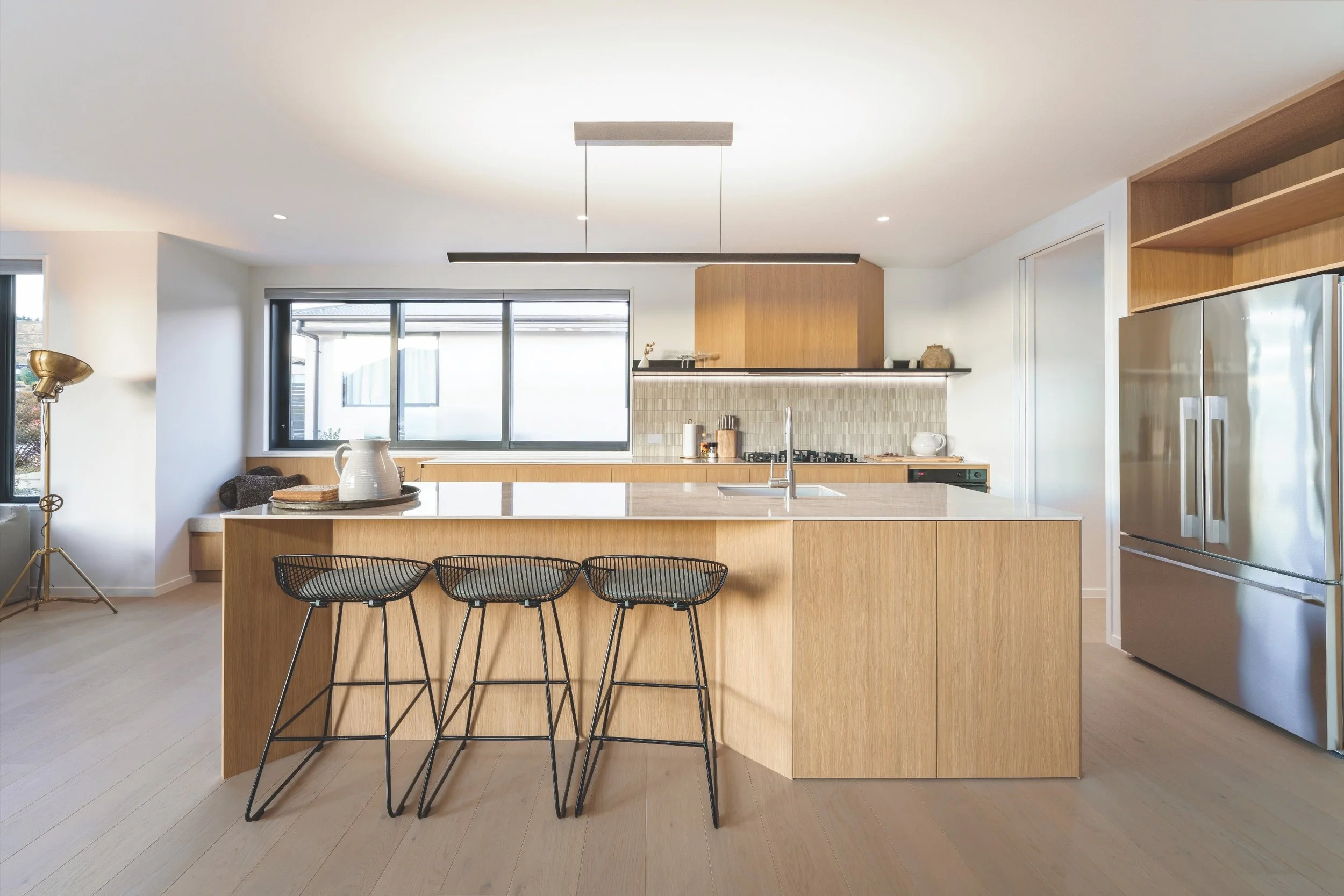 The kitchen doors in colour Ruakaka are made by Sage Doors, using the Timbalook product imported from Europe. They are designed to imitate a natural oak veneer, but are much more affordable, durable and colourfast.