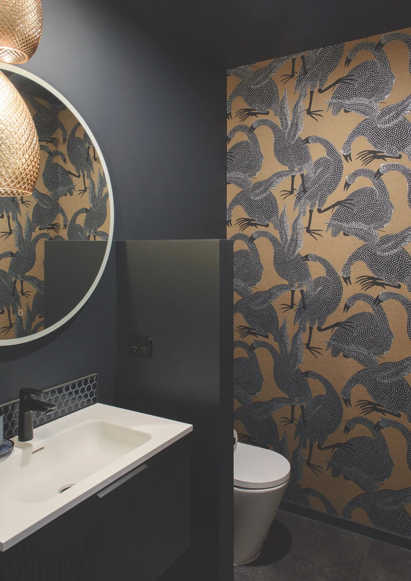 For me, colour is about emotion, reflective of the people living in a space, and is one of the most powerful design tools we have. When used intentionally, it elevates every other element. Colour in this home was about warmth, depth and personality. The main living areas are in Resene Quarter Napa, a soft neutral that sits beautifully in natural light and is calm without feeling flat. Doors were taken slightly deeper in Resene Quarter Craigieburn, adding subtle, cohesive definition. Ceilings were finished in Resene Milk White, keeping the spaces feeling fresh and light. In the powder room, a playful wallpaper was paired with Resene Double Cod Grey for a more dramatic statement.