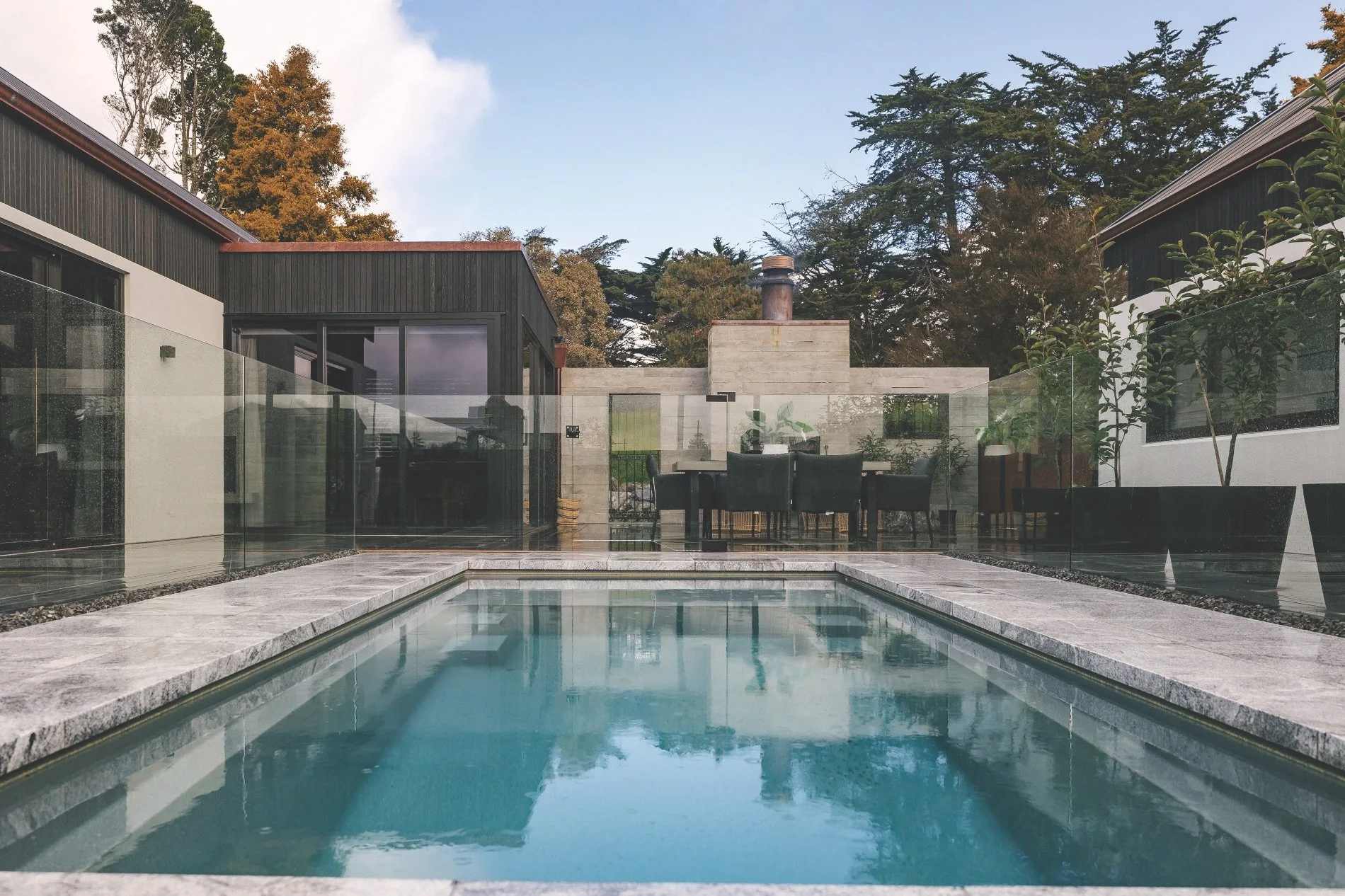 This house, a generous connection of pavilions with a courtyard and pool house and adjacent to a golf course in Palmerston North, was a special case. It was built by Ben Cousins of Inhouse Construction as his own family home, and Nicola had already collaborated closely with him and Precinct Architecture on several previous projects.