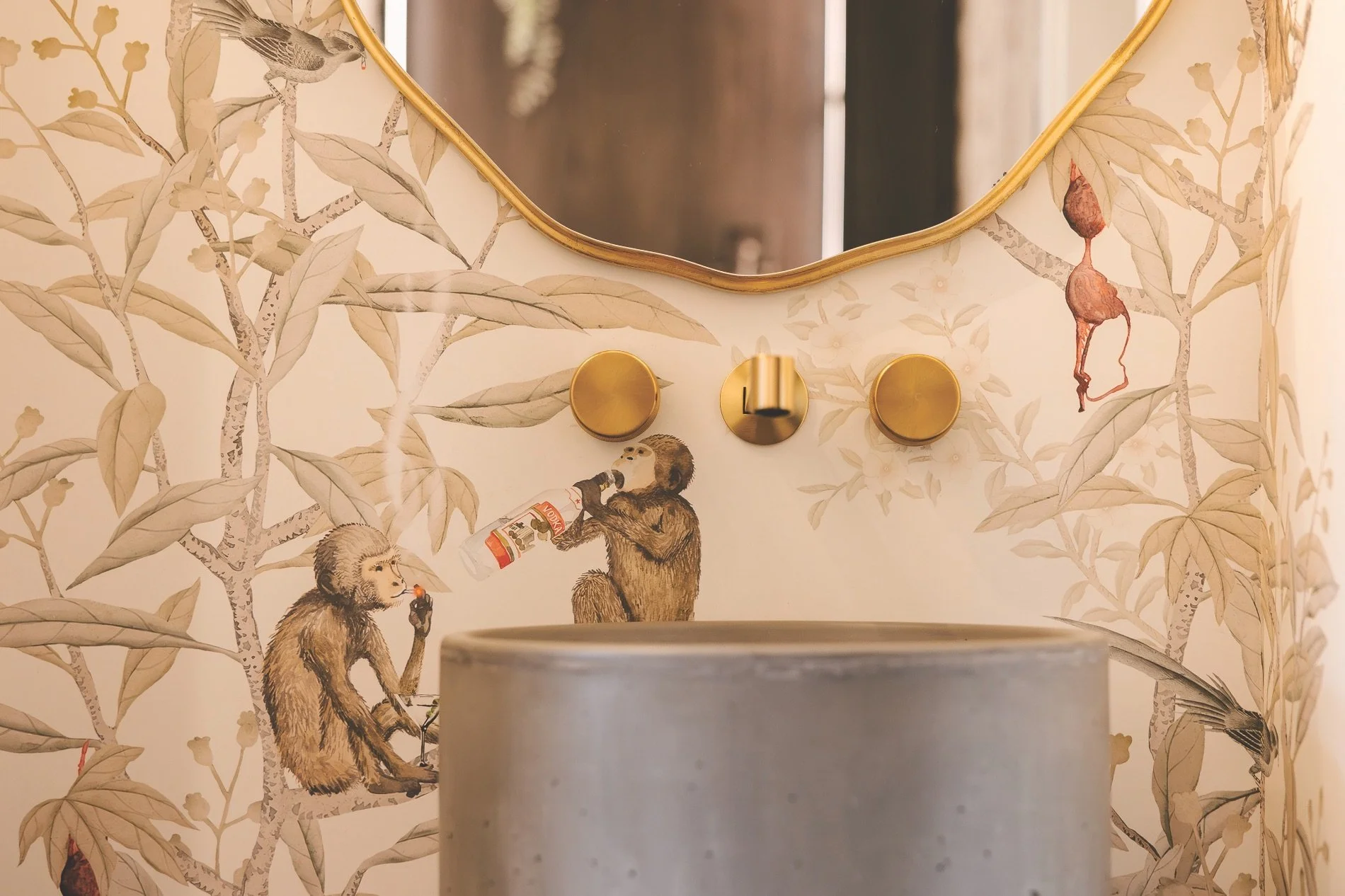 This sense of humour – the suspended rowboat, a full-on golf simulator, the “drunken monkeys” powder- room wallpaper – creates moments of surprise.