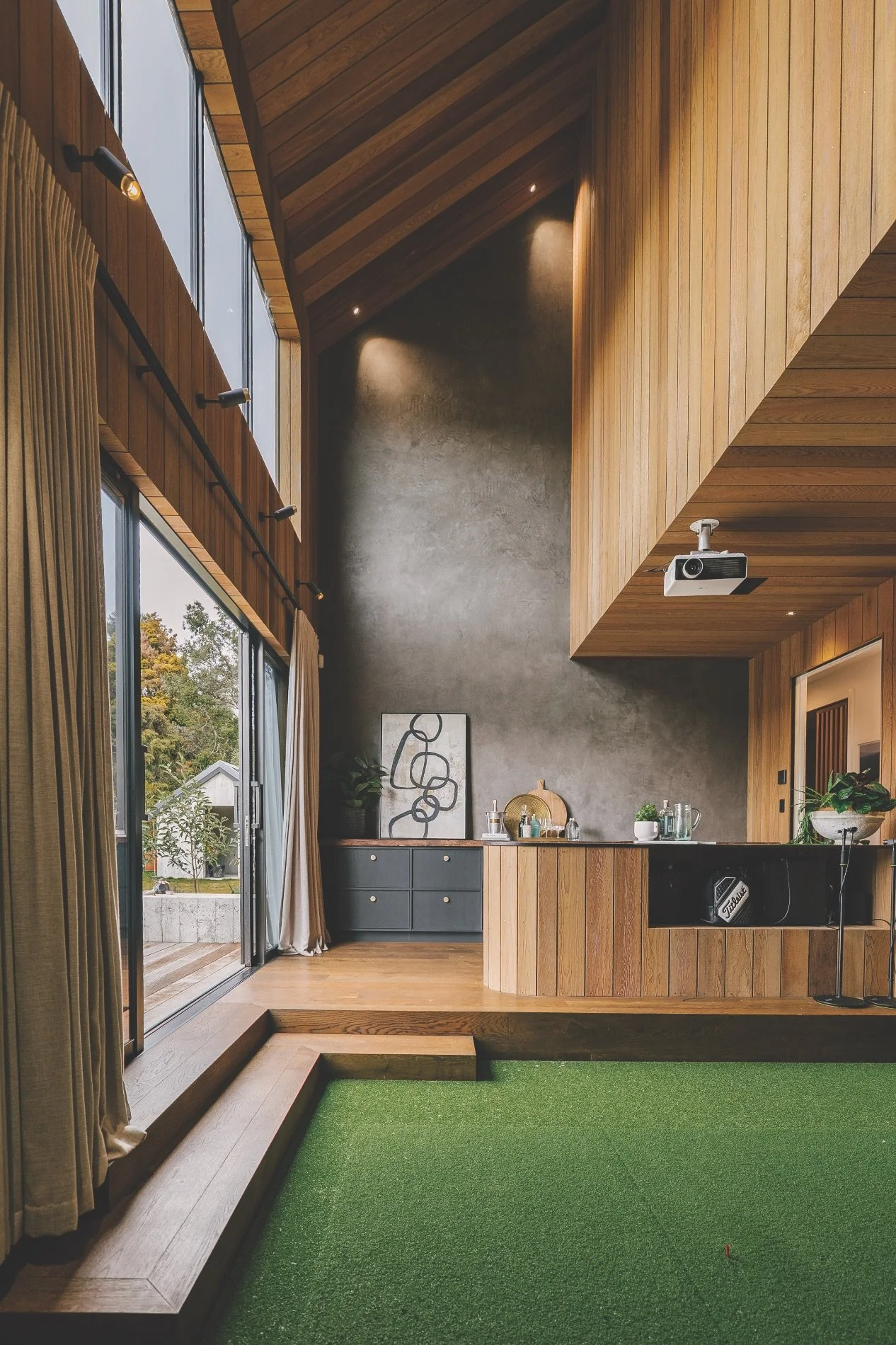 The Rockcote Integra lightweight concrete facade system was finished in Classico pre-coloured acrylic plaster, and painted in Resene Half Delta. Inside, the feature wall in the golf simulator room also utilises a Resene Construction Systems finish: Rockcote Otsumigaki Clay/Lime Artisan Plaster.