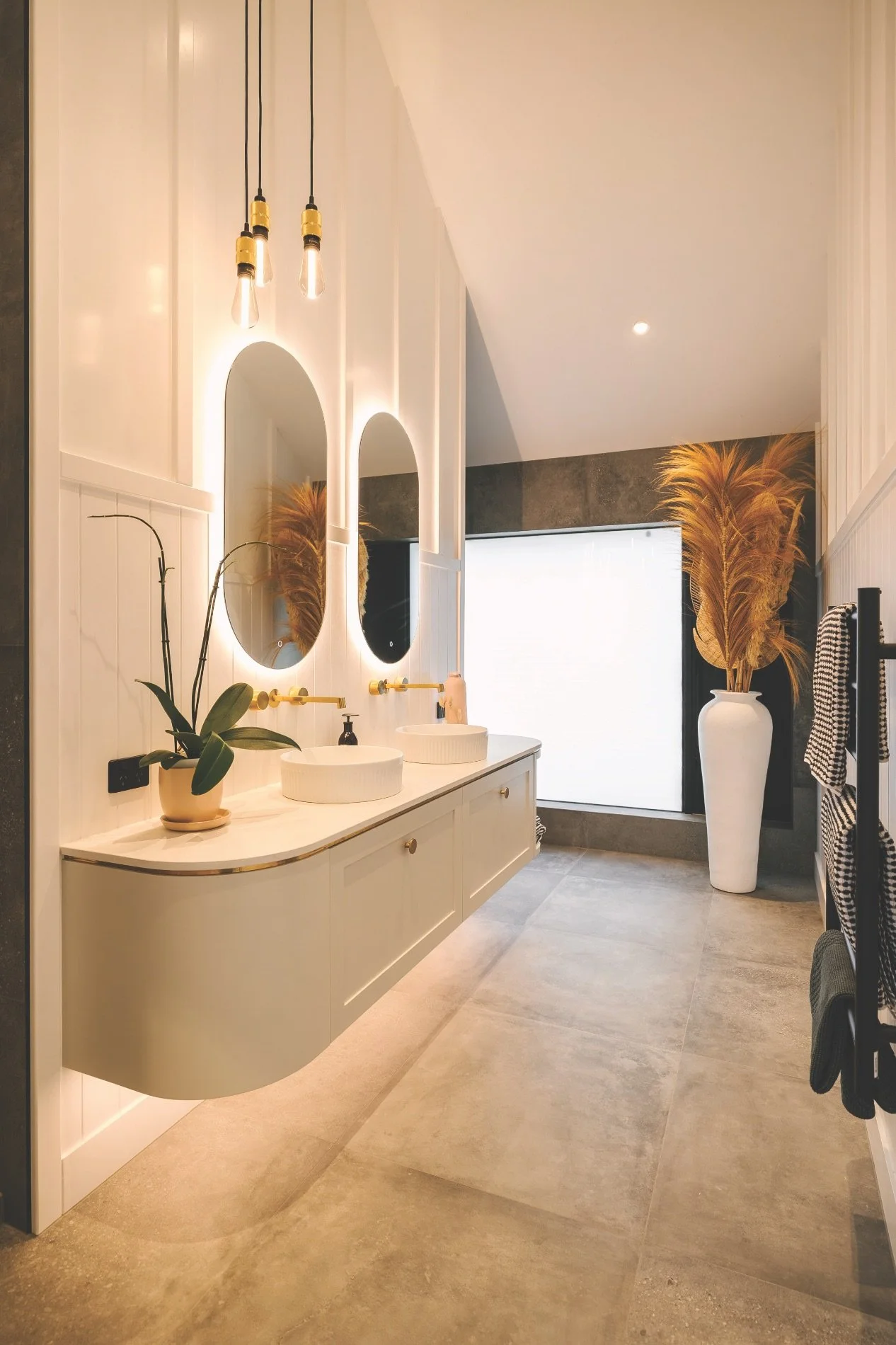 Ben always has a vision for how he wants a space to look, she says, and then it’s just a matter of layering everything in. This often features stone, timber, metal and concrete, warm colours and biophilic inclusions. “The more natural it feels, the better,” she says. “There’s a real honesty to the material palette.”