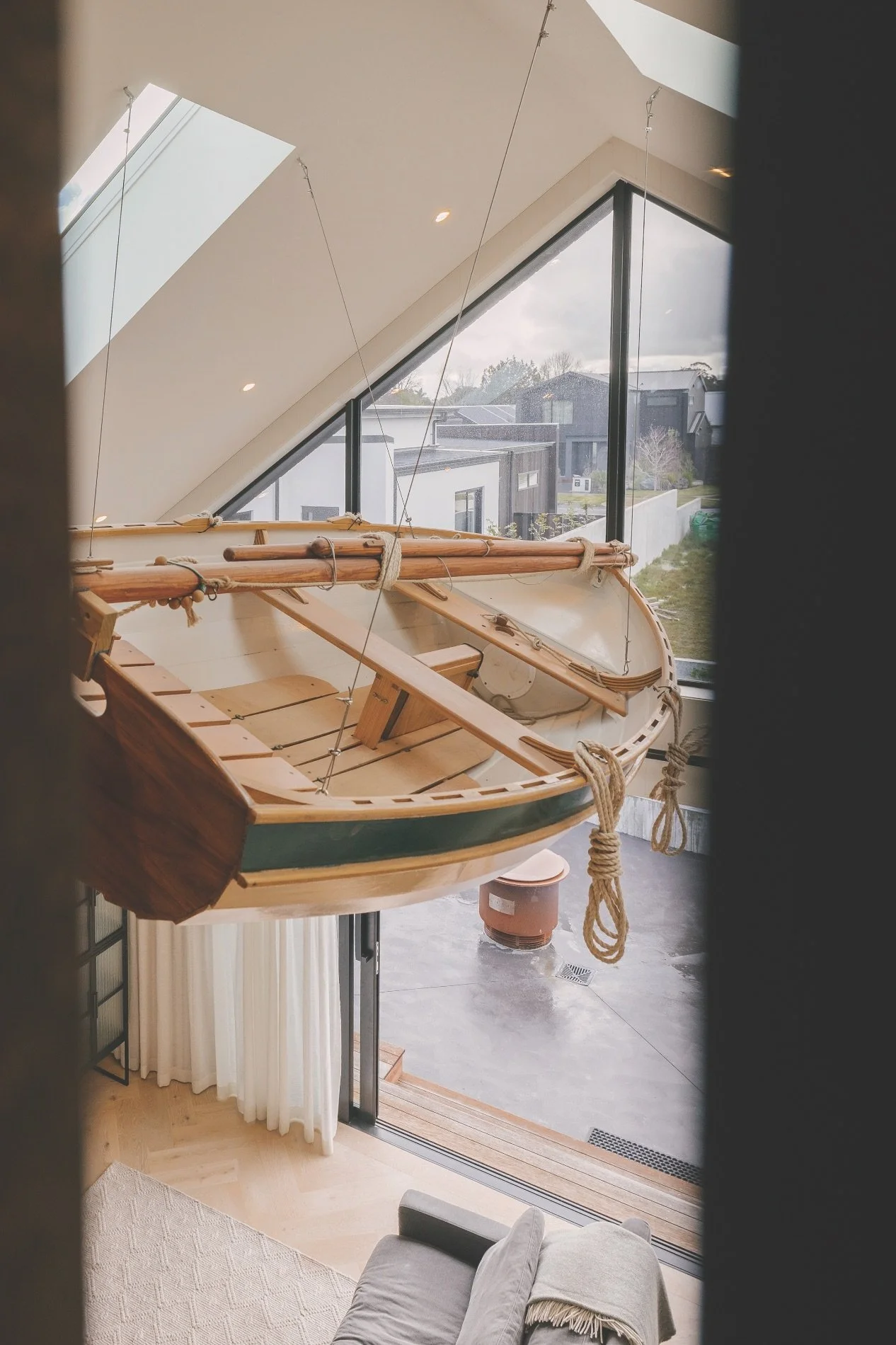 In addition, there’s a sense of playfulness, which was really embraced this time. “Ben is always looking for something that’s a little bit quirky, which is so fun for me: the design discovery between us is quite collaborative. He’ll come into my studio, we’ll chat about the things that we’re liking. This time, I got a phone call from him, saying, ‘I’m thinking that we should have a clinker boat hanging from the ceiling of the pool house. Do you know where you could find one?’”